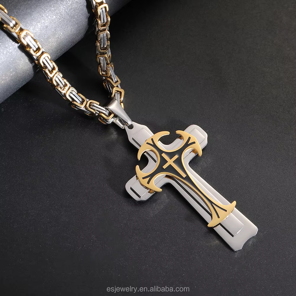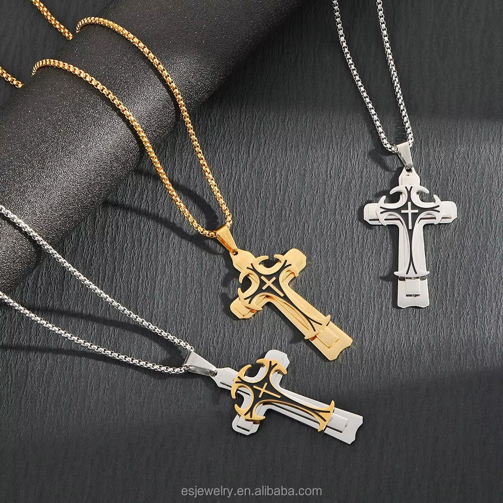 Men's Vintage Three-Layer Cross Pendant Necklace Long Chain with Dominating Pattern